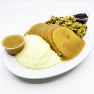 2lbs Of Sliced Turkey Breast, 2lbs Of Mashed Potatoes, 2lbs Of Traditional Stuffing, and dressed in 16oz Of Turkey Gravy This item does not come hot please see reheating instructions.